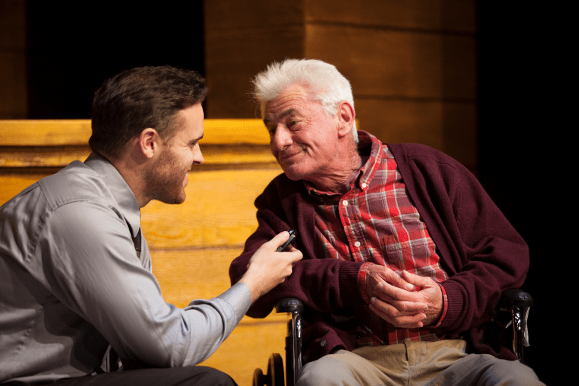 At the Sierra Madre Playhouse, Mitch is played by Jackson Kendall, and Larry Eisenberg is Morrie. They are directed by L. Flint Esquerra. The actors deliver an emotional story that hardly keeps a dry eye in the house. It’s, however, sprinkled with humor and witty lines that are well delivered and welcomed. As Lou Gehrig’s Disease progresses, a person has difficulty walking, becomes clumsy, has trouble swallowing, and experiences cramps and twitching in the arms and shoulders. In the course of the play, Eisenberg mesmerizingly transforms his body to show all of those symptoms.