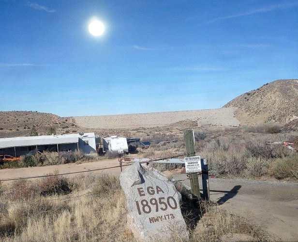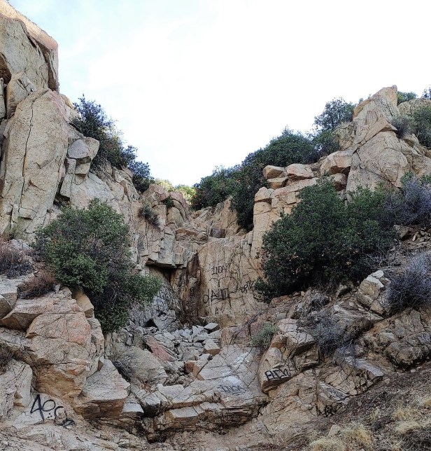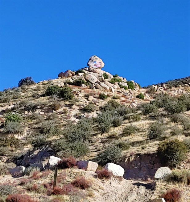 This is a perfect hike during COVID because it has light transit, and it’s also quite easy. The trail is part of the Pacific Crest Trail and is in the general area of the Mojave Fork Dam, near Hesperia. The easiest way to find it is to search for the Etiwanda Game Association (see exact address below). Once you see the rock pictured below (notice it has a flag painted on it), you’ve found it. There will be entrances to the trail both on the left and the right. What I write here describes what you’ll see if you follow the left entrance (when facing the rock).