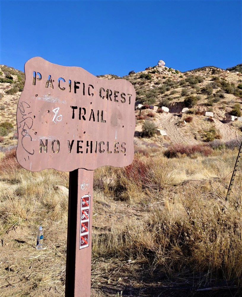 This is a perfect hike during COVID because it has light transit, and it’s also quite easy. The trail is part of the Pacific Crest Trail and is in the general area of the Mojave Fork Dam, near Hesperia. The easiest way to find it is to search for the Etiwanda Game Association (see exact address below). Once you see the rock pictured below (notice it has a flag painted on it), you’ve found it. There will be entrances to the trail both on the left and the right. What I write here describes what you’ll see if you follow the left entrance (when facing the rock).