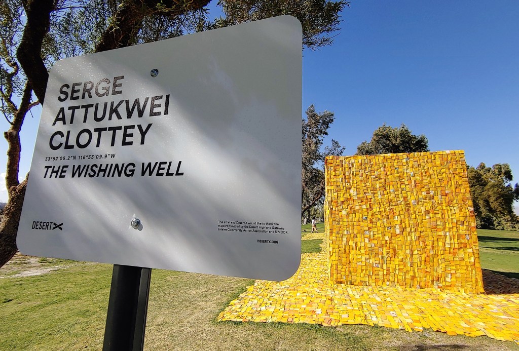 Another must-see art piece is THE WISHING WELL, by Ghanaian artist Serge Attukwei Clottey. He erected two large cubes covered by woven squares made up of bright yellow plastic gallon bottles used in Ghana to transport water. Aside from its themes of imperialism and environmental justice, this work ties in well with the overall exhibition due to the prime importance of water in this desert area.