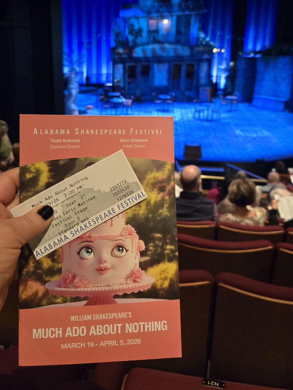 Shakespeare’s Much Ado About Nothing at the Alabama Shakespeare Festival is a lively, romantic comedy centered on two very different couples… the sweet and sincere Hero and Claudio, and the sharp-tongued, endlessly entertaining Beatrice and Benedick. While one relationship faces deception and misunderstanding, the other unfolds through witty banter and reluctant attraction. As with many of the Bard’s works, the story blends love, mischief, and mistaken identity into something both humorous and surprisingly heartfelt.